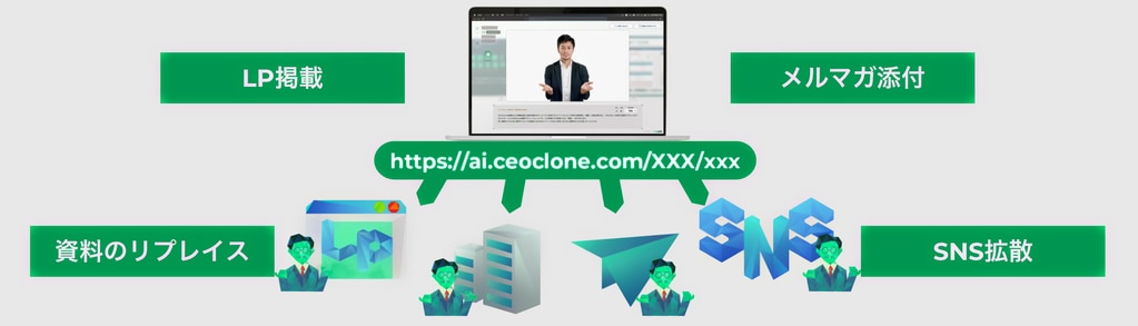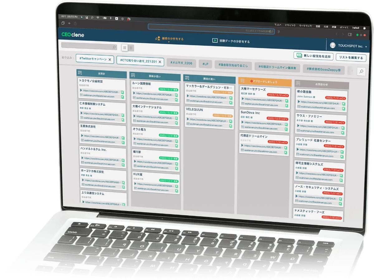 A. | CEOクローンは各種CRMツールとの連携や、広告、SNS、さまざまなタッチポイントでご利用いただけます。利用方法などについての弊社セールスエキスパートのコンサルティング提供、ツールの独自カスタムも可能です。 |
